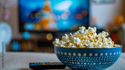 Popcorn in a blue bowl with remote control on sofa infront of the tv in living room