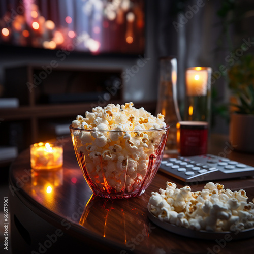 Popcorn in a glass bowl and a remote control in front of the TV in the home interior