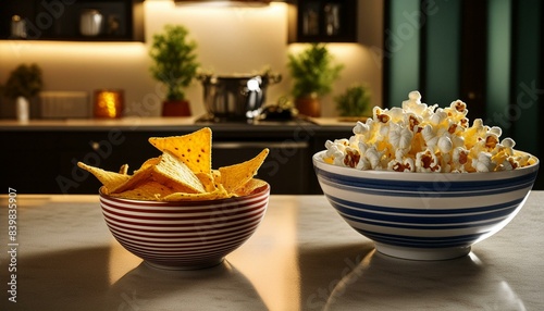 Popcorn in a striped bowl on table; nachos in a bowl; kitchen counter
