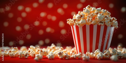 Popcorn overflowing from a striped container on a vibrant red background with scattered popcorn pieces