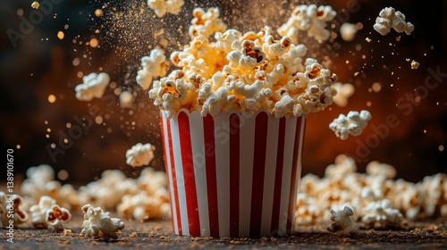 Popcorn overflowing from striped container with bokeh and warm tones