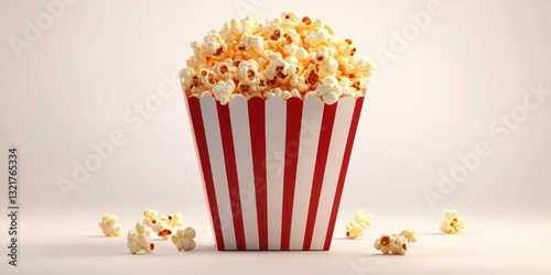 Popcorn served in a classic striped container with spilled kernels on a light background during a snack time