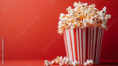 Popcorn served in a striped container on a vibrant red background, ready for movie night at home