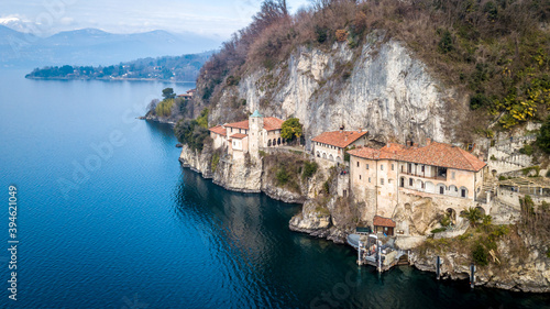 popular and famous place of Lake Maggiore Eremo di Santa Caterina del Sasso, Lombardy, Italy.