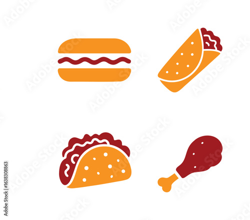 Popular Fast Food Flat Icons Set, hot dog, sandwich, burrito, taco, and chicken leg. Vector Color Silhouette Illustration.