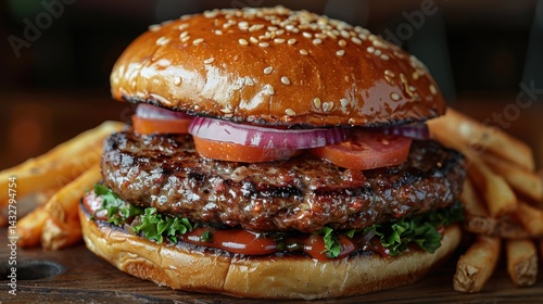 Popular Food Close-up of gourmet burger with fries, rustic table