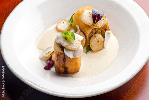 Pork belly. Pork belly seasoned with cracked black pepper and grilled. Pork served with classic steakhouse side dishes: asparagus and mashed potatoes. Classic fine dining entree.