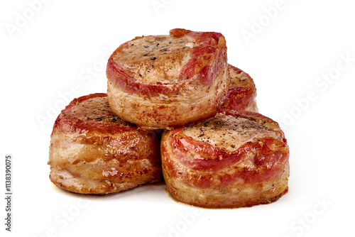 Pork fillet wrapped in bacon, isolated on white background.