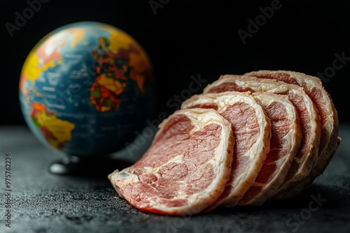 pork meat besides a miniature world globe. illustrating world pork supply , product, export, import, global pork meat supply , world supply