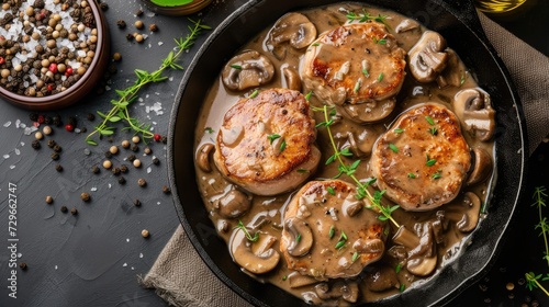 Pork medallions with mushroom gravy in cast iron pan over dark stone background. Top view, flat lay
