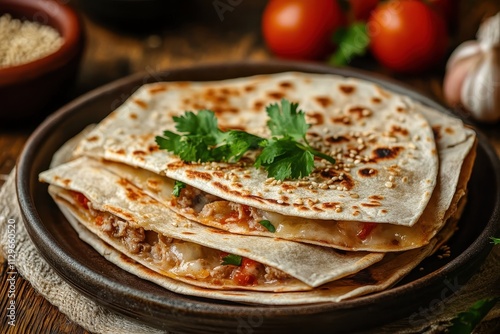 Pork quesadilla topped with sesame seeds on a ceramic dish