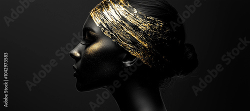 portait woman with its head backwards with golden detail black and white art beautiful majestic composition, dark background
