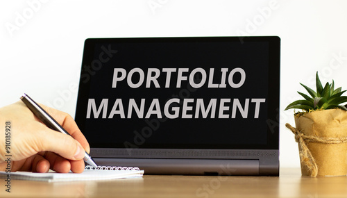 Portfolio management symbol. Concept words Portfolio management on beautiful black pad. Beautiful white background. Businessman hand. Business Portfolio management concept. Copy space.