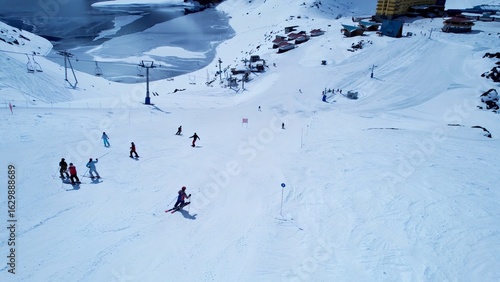 Portillo Ski Station Centre In Andes Mountains Valparaiso Chile. Skier Skiing Downhill On Empty Ski Slopes In The Mountains. Nature Travel Destination Snow Covered Forest Trees.