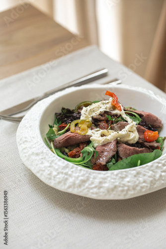 Portion of roast beef salad with stracciatella and tomatoes
