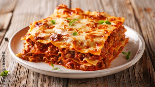 Portion of traditional italian lasagne/lasagna on white plate