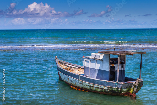 Porto Seguro Beach at sunset with fishing trawler motorboat in BAHIA, Brazil