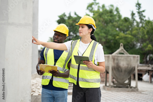 Portrait African American engineer man use clipboard and Hispanic latin engineer woman use tablet computer checking precast cement at precast cement outdoor factory