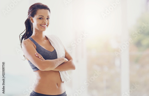 Portrait, arms crossed and fitness with woman and smile for workout break, exercise and health. Wellness, training and athlete with person for energy, challenge and sports center mockup space