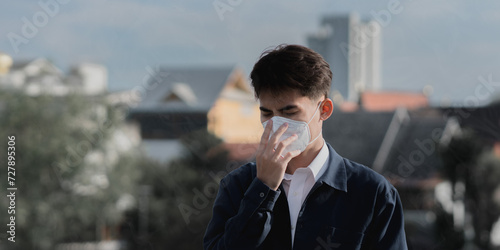 Portrait Asian young man wear N95 mask to protect PM 2.5 dust and air pollution. Young man wearing protection mask over smog city building with bad weather, pm2.5, lung cancer, City air pollution.