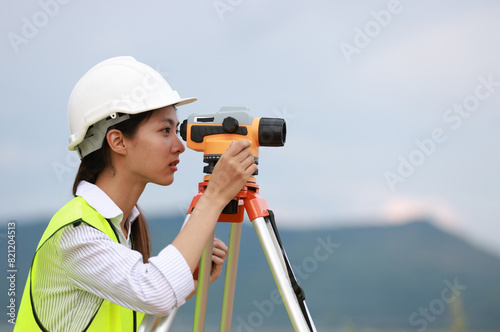 Portrait beautiful Asian construction engineer with a green safety vest hard hat and level survey camera.Engineer peering through a theodolite