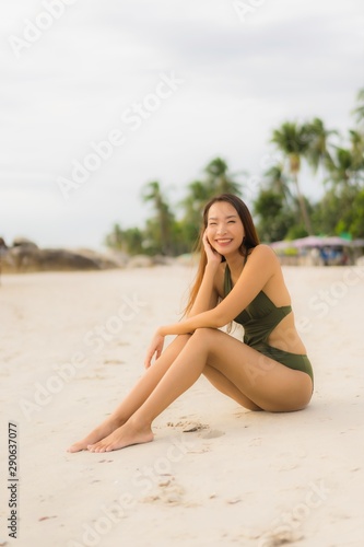 Portrait beautiful asian women happy smile relax on the tropical beach sea ocean