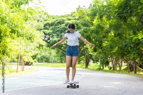 Portrait beautiful sportive Asian female skater , smiling with happiness, standing on skateboard and playing outdoor with copy space. Activity Concept
