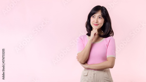 Portrait beautiful young asian woman thoughtful thinking an idea isolated on pink pastel background. Teenage female person pretty smile with thinking gesture concept.