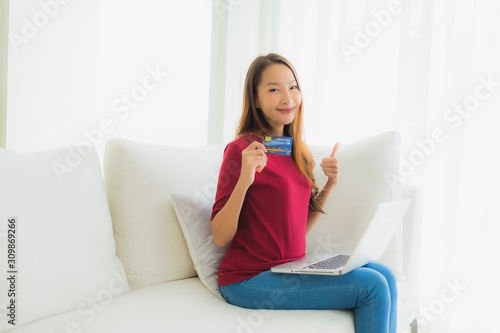 Portrait beautiful young asian women using computer laptop with mobile phone and credit card