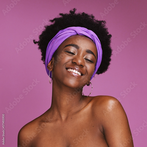 Portrait, beauty and skincare with a model black woman on a pink background in studio for natural care. Face, hair and headband with an attractive young female posing to promote cosmetic treatment