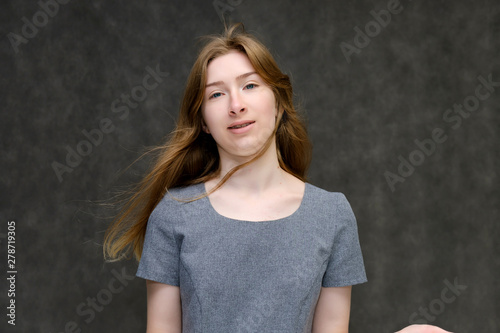 Portrait below the chest of a young pretty brunette girl woman with beautiful long hair on a gray background in a gray dress. He talks, smiles, shows his hands with emotions in various poses.