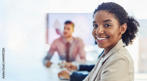 Portrait, business or black woman with a smile, banner or professional with confidence, success or meeting. Face, African person or employee in a workplace, overlay or company development with mockup