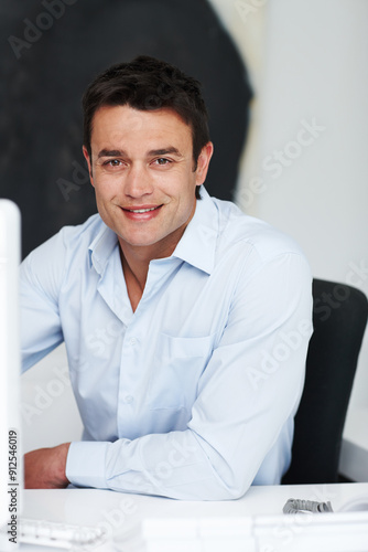 Portrait, businessman and working on desktop for startup, research and planning with ideas. Office, solution and social media manager with computer for report, content creation and creative agency