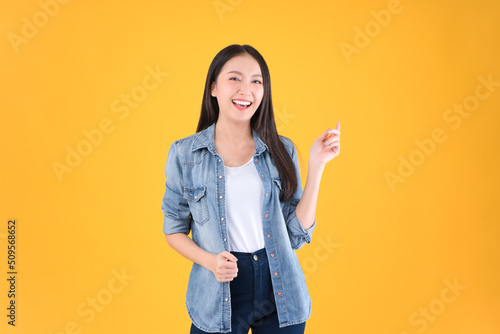 Portrait Cheerful young asian female wearing jeans posing fashionable jeans clothes in a stylish yellow background.