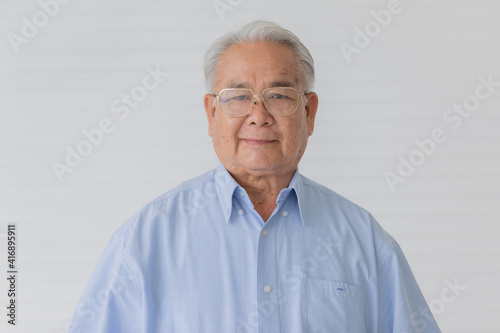 Portrait close up shot of asian old fat male model with short white and gray hair wearing eyeglasses and light blue shirt with stand smiling in front of white background