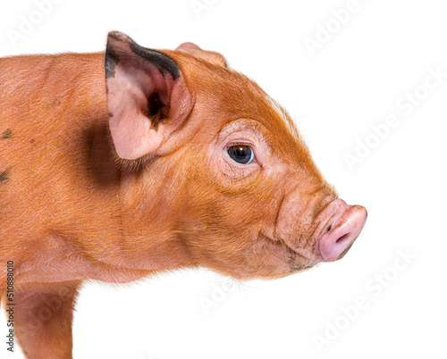 Portrait close-up of a young pig head (mixedbreed), isolated