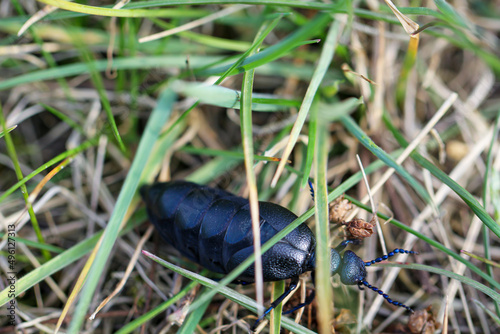 Portrait eines Schwarz Blauen Ölkäfer. Diese Käfer sind giftig und sondern eine giftige gelbe Substanz ab.