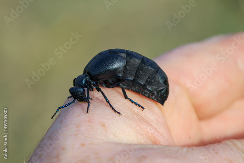 Portrait eines Schwarz Blauen Ölkäfer. Diese Käfer sind giftig und sondern eine giftige gelbe Substanz ab.