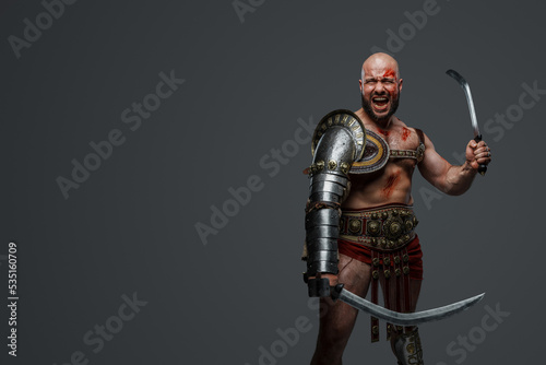 Portrait fo violent ancient gladiator screaming holding two swords against grey background.