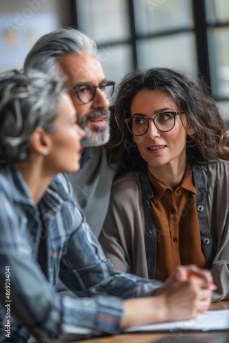 Portrait half-body of an American couple consulting with a business advisor, hyper-realistic, high detail, photorealistic