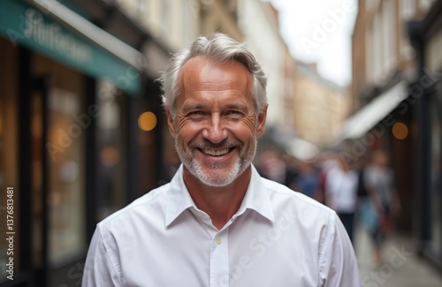 Portrait handsome mature man smiles at camera in London. Cheerful person with grey hair in urban setting. Successful entrepreneur, businessman, mid-life, positive emotion, looking directly.