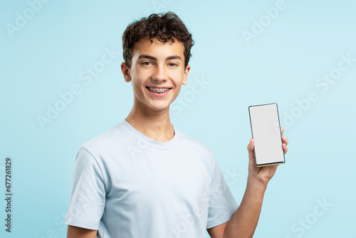 Portrait handsome smiling guy with braces wearing white t shirt holding mobile phone, blank screen