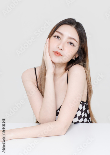 Portrait happy cheerful young asian beautiful woman gently clean fresh skincare, showcasing healthy smile look at camera on white background Ideal facial glowing treatment promotions wellness campaign