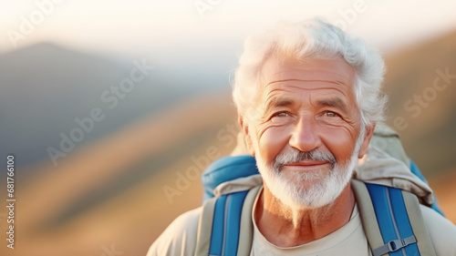 Portrait happy elder man tourists of hiker sporty people walks in mountains at sunset with backpacks. Concept banner adventure with copy space