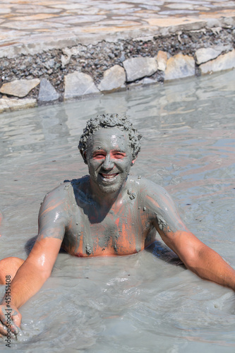 Portrait happy man who takes a mud bath. Dalyan, Turkey