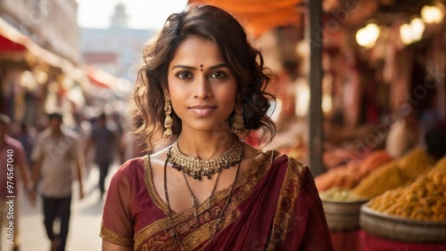Portrait happy woman in traditional Indian attire, standing in marketplace with blurred background, depicting cultural and ethnic diversity