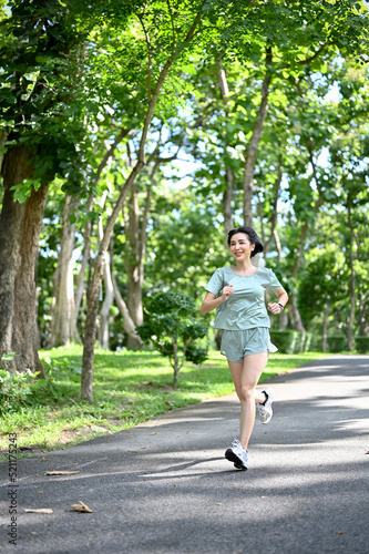 Portrait, Healthy fit millennial Asian woman running or jogging in the green city park.