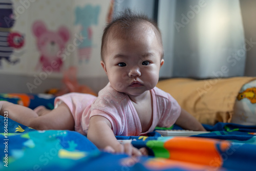 Portrait image of happy local lifestyle Asian Chinese baby girl on bed