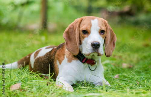 Portrait of cute beagle dog on a green meadow