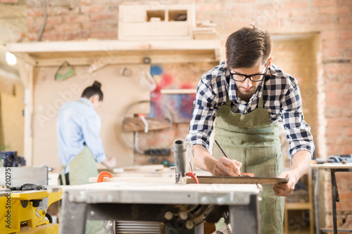 Portrait of handsome skilled carpenter working with wood in modern joinery shop, copy space
